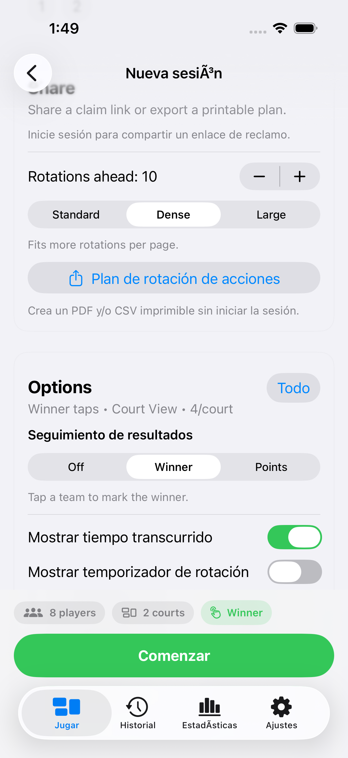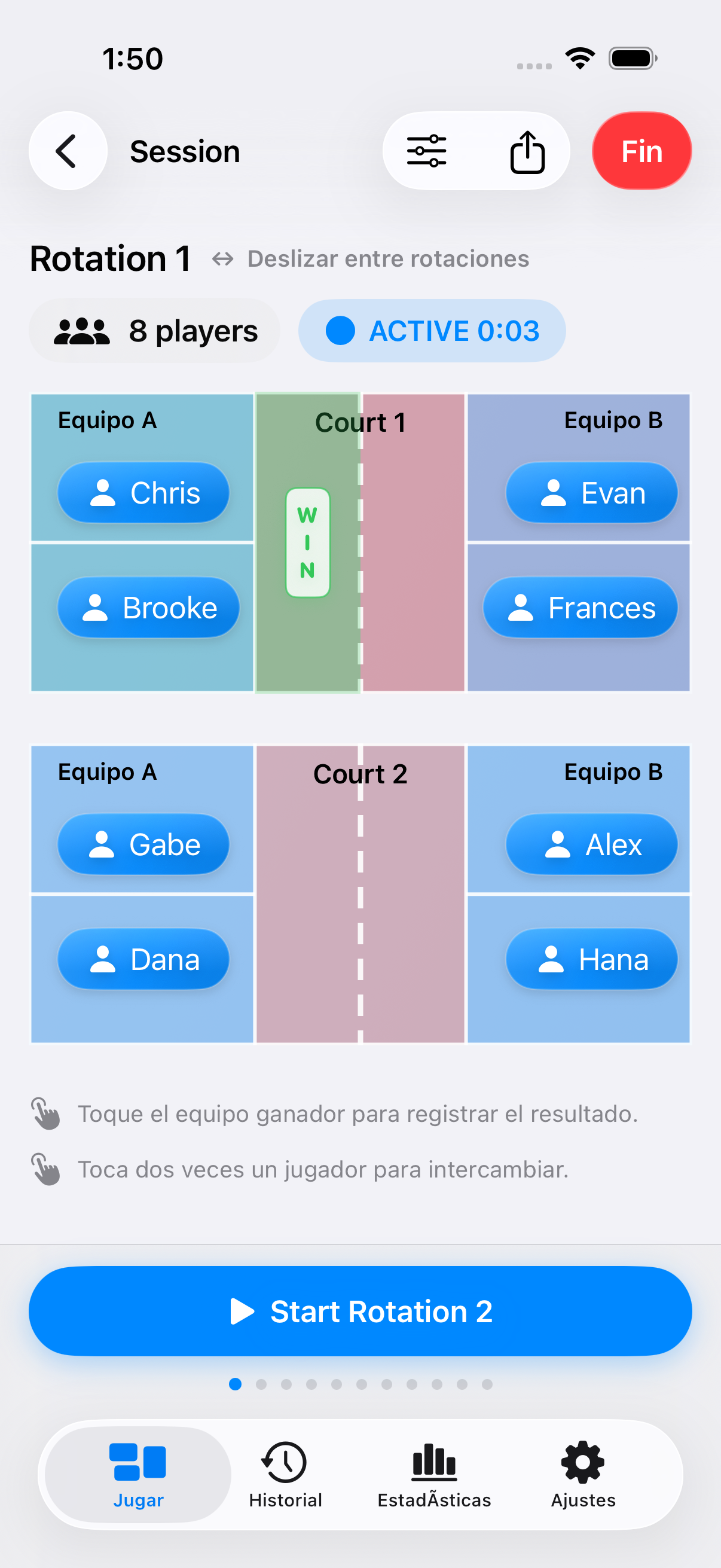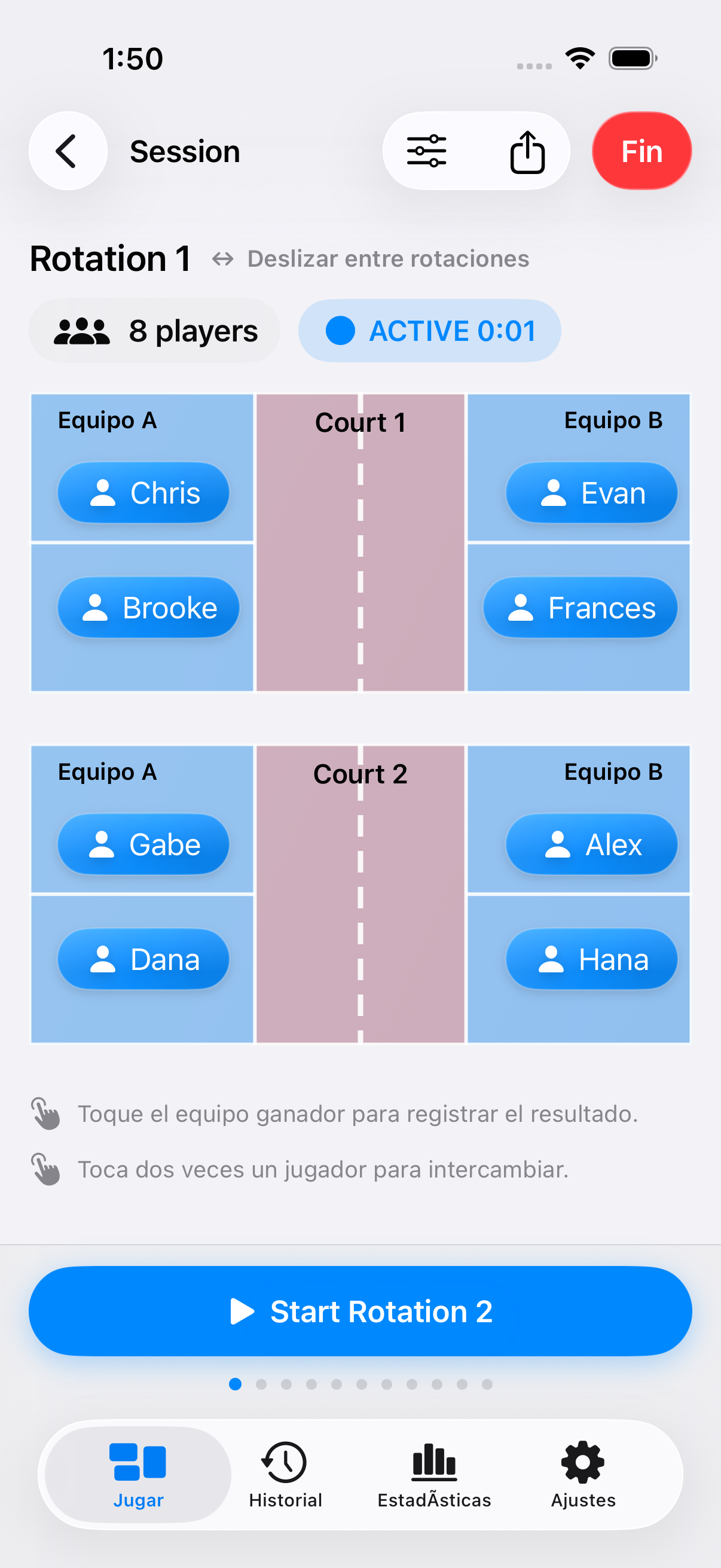Rotaciones de pickleball rápidas y justas — en segundos.