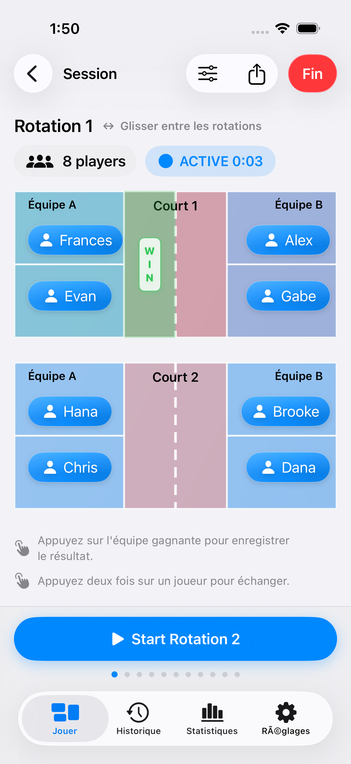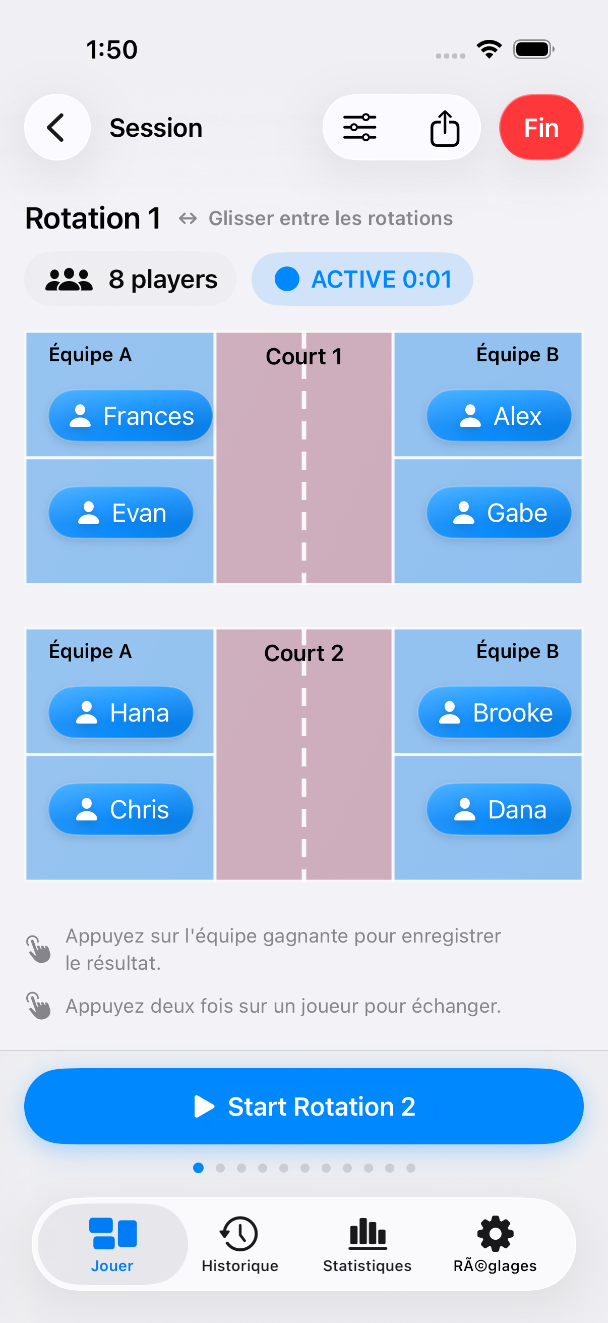 Des rotations de pickleball rapides et équitables — en quelques secondes.